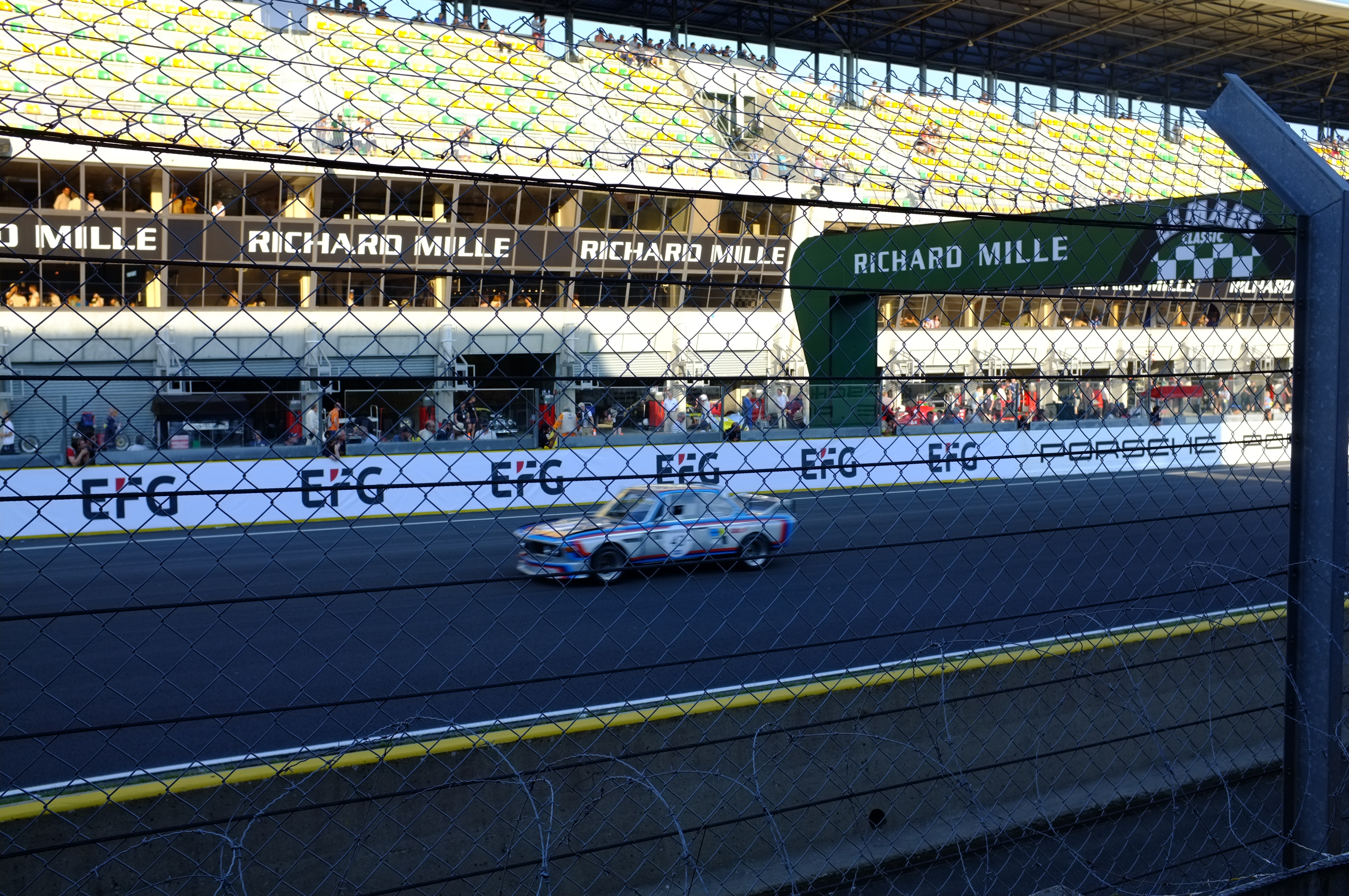 Arriving at the circuit is quite something, there’s an air about the place, the noise, the endless amount of old cars and bikes and the famous clock overlooking the start flanked by huge grandstands. BMW 3.0 CSLs becoming a multi coloured blur as they rush past my camera. They sound fantastic, with the straight six winding its way up the rev range, if a little quieter than some.