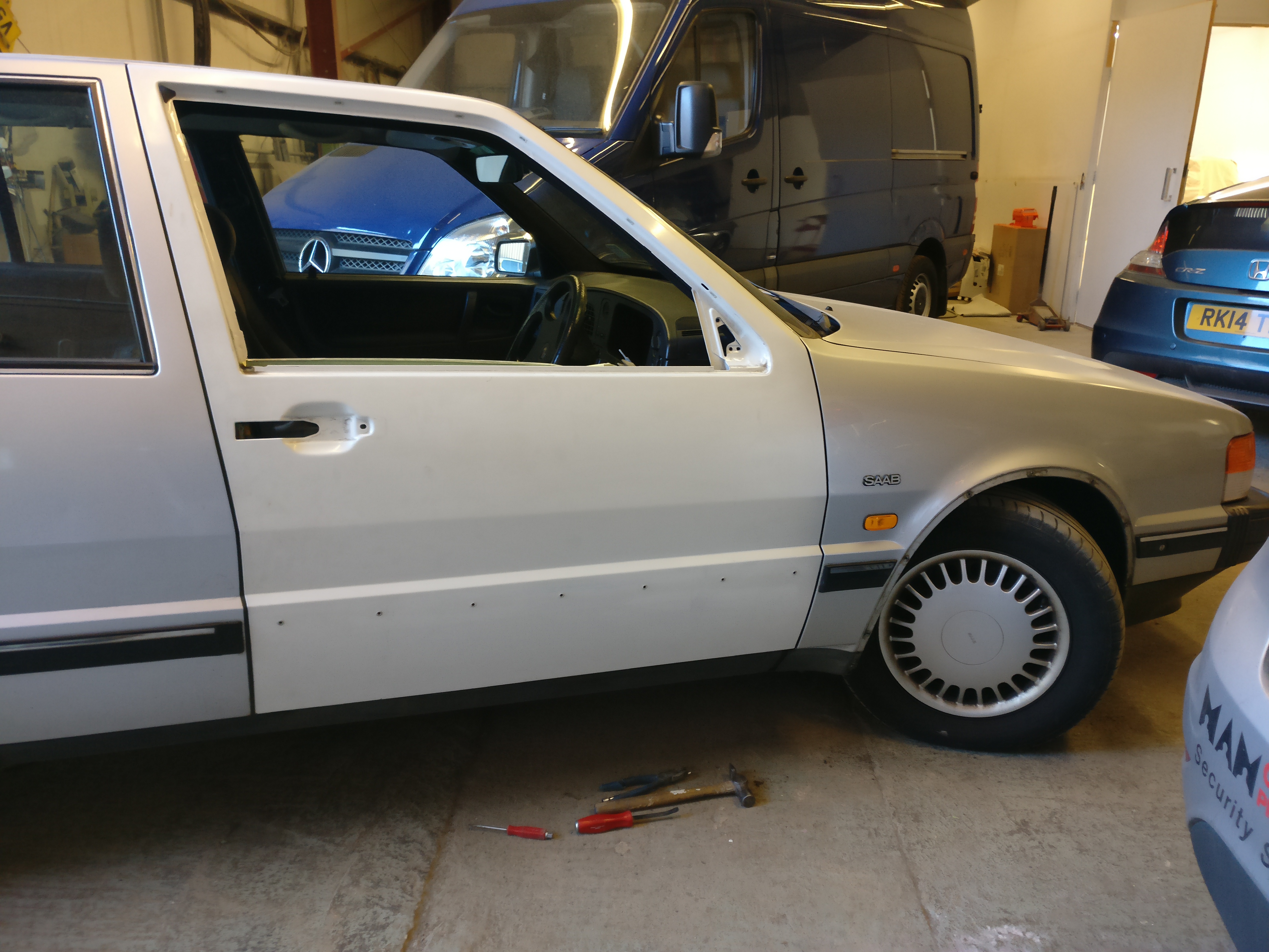 I had bought a replacement drivers door from Two Stroke to Turbo as the original was bubbling from when I bought it. It was of course white, silver apparently being difficult to match would have meant a repaint anyway. Mk1, or CC (Combi Coupe) 9000s parts are less common and therefore more expensive that the later CS parts.